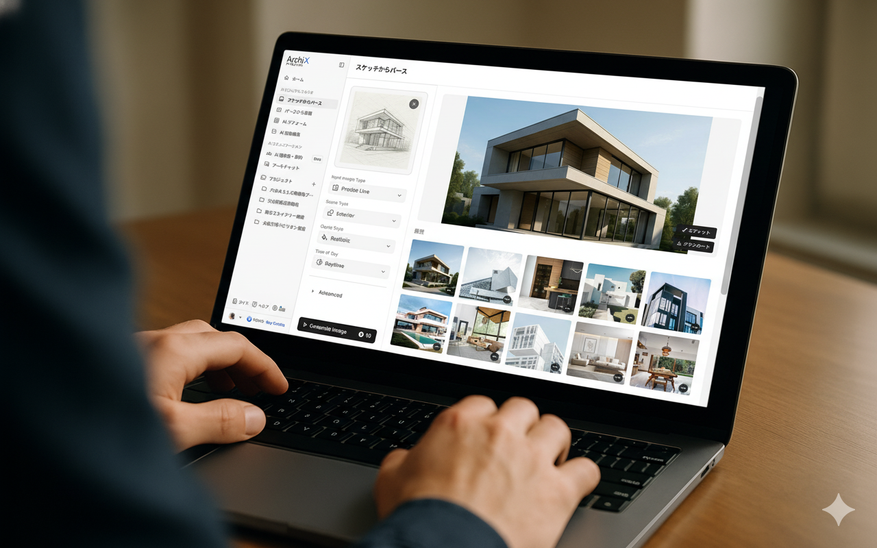プロンプトで細かな調整をする必要がないため、AIに詳しくない人でも正確で一貫性のあるパースを即座に生成でき、日常の設計検討やプレゼン資料作成をスムーズに進めることが可能になります。